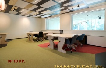 Cette annonce propose un exemple (parmi tant d'autres) de bureau séparé de type "Prestige" pour pouvant accueillir jusqu'à 8 personnes ainsi que +/- 2500m² de magnifiques espaces communs inclus dans l'offre.